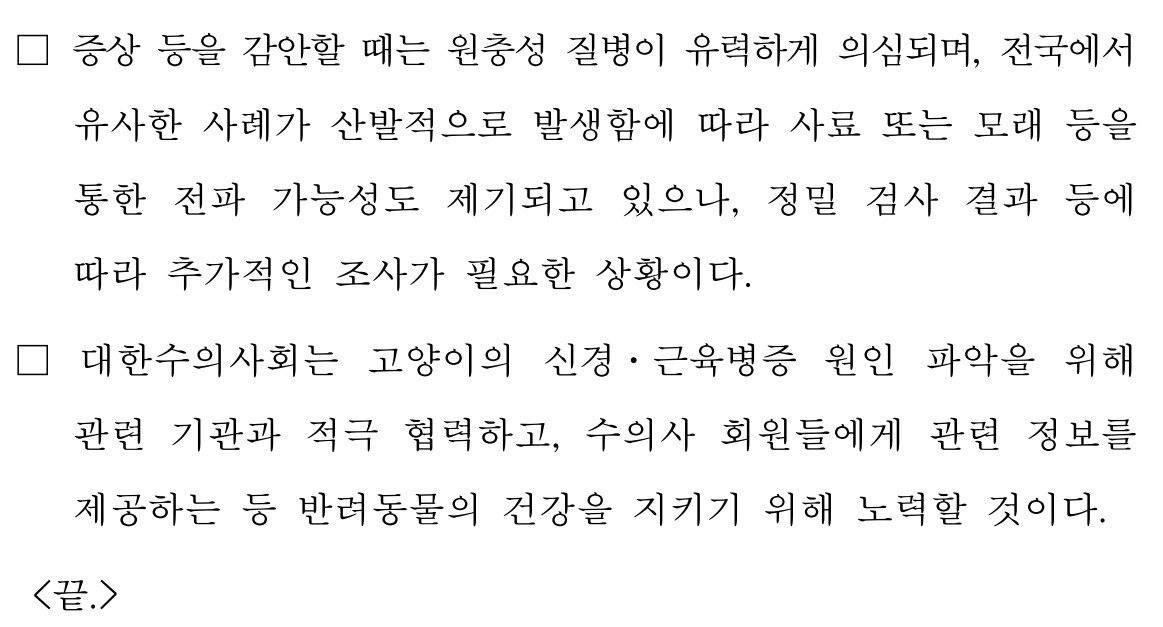#대한수의사회 #동물병원 #반려묘 #고양이사료 #고양이모래 #반려동물용품 #원충성질병 #전염성 #원인불명 #신경근육병증 #식욕부진 #기력저하
