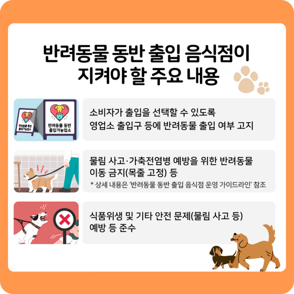 관련 규정을 알고 있으시면 영업장에 고객이 방문하면서 볼 수 있는 반려동물 동반 출입에 대한 안내와 규정을 전시할 수 있는데 도움이 되시면 좋겠습니다.