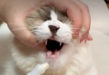 4. 다른 한 손으로 고양이 머리를 잡고 엄지와 검지로 입 끝을 살짝 눌러 입을 벌릴 수 있게 한다.